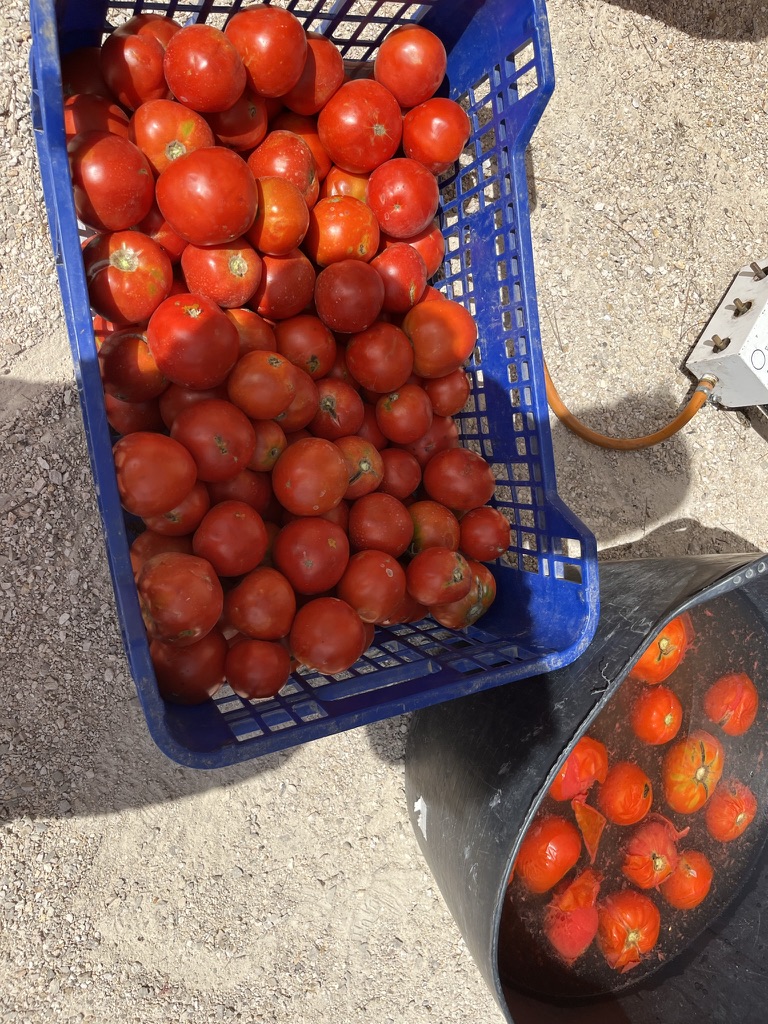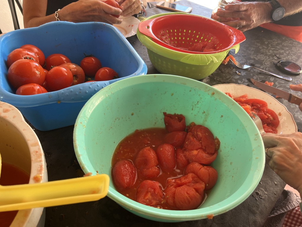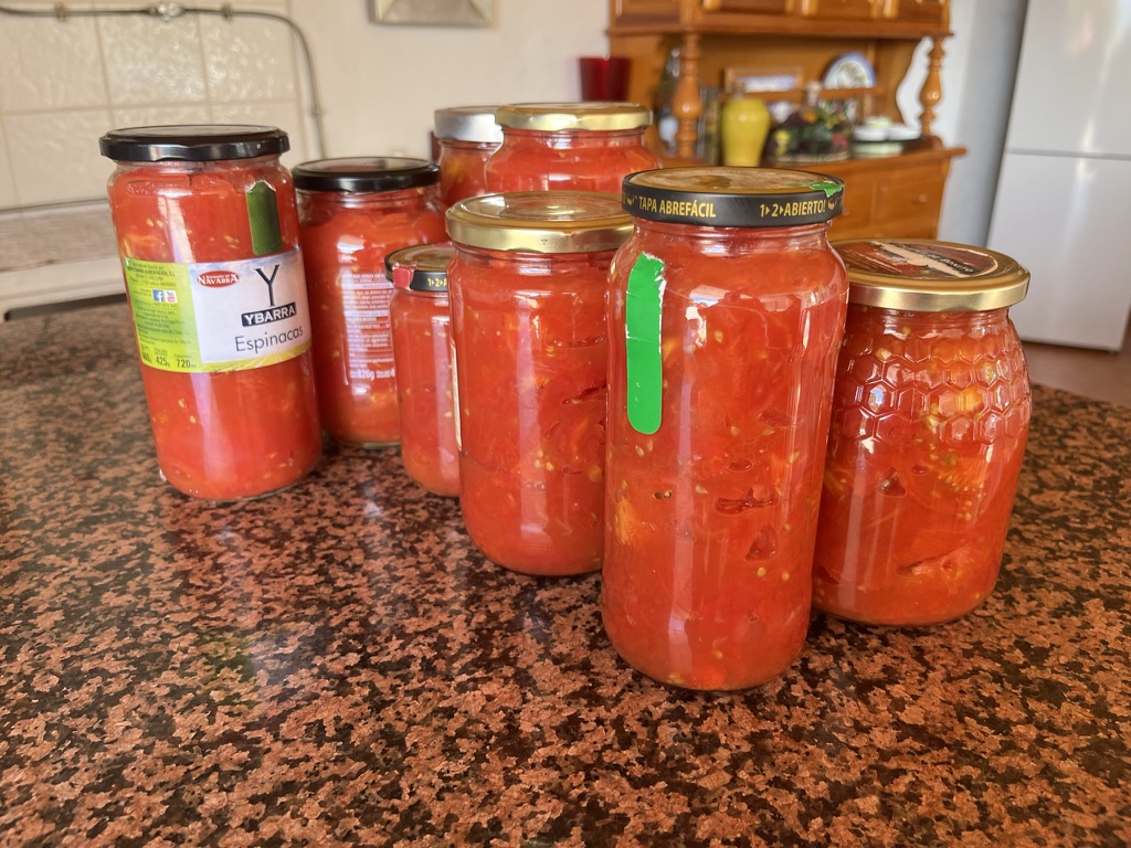 Conserva. Cultivar el huerto y recoger la cosecha (tomate, berenjena, pimiento, judía…), amontonar y lavar botellas y tarros de vidrio, mantener vivo el fuego, escaldar tomates, pelar, embotar, dejar enfriar, guardar. Y tiempo.