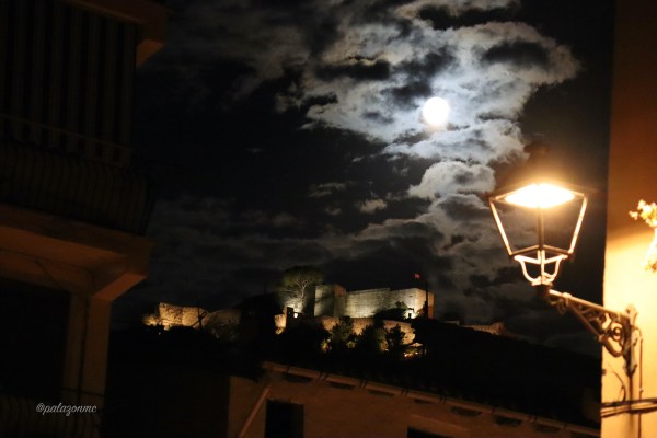 Por mucho que el impertinente farol se empecinara en llamar la atención de los viandantes, la luna radiante lo eclipsaba y acaparaba todas las miradas. Suerte que solo era cuestión de días que desapareciera esa engreida. Imagen: Castillo de Xàtiva desde la plaza Sant Jaume